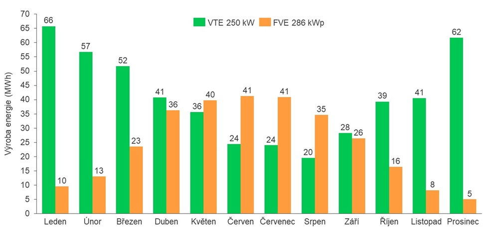 Jak vypadá kombinace fotovoltaiky (výkon 286 kWp) a větrné turbíny (výkon 250 kW) v praxi: