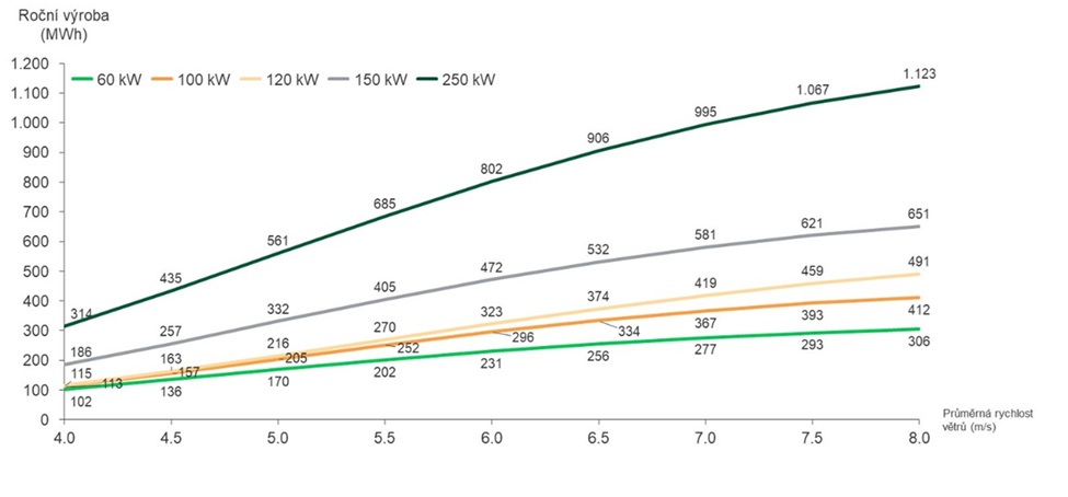 výroba větrné elektrárny přímo závisí na průměrné rychlosti větru v lokalitě. Rozdíl mezi průměrnou rychlostí větru 5 m/s a 7 m/s